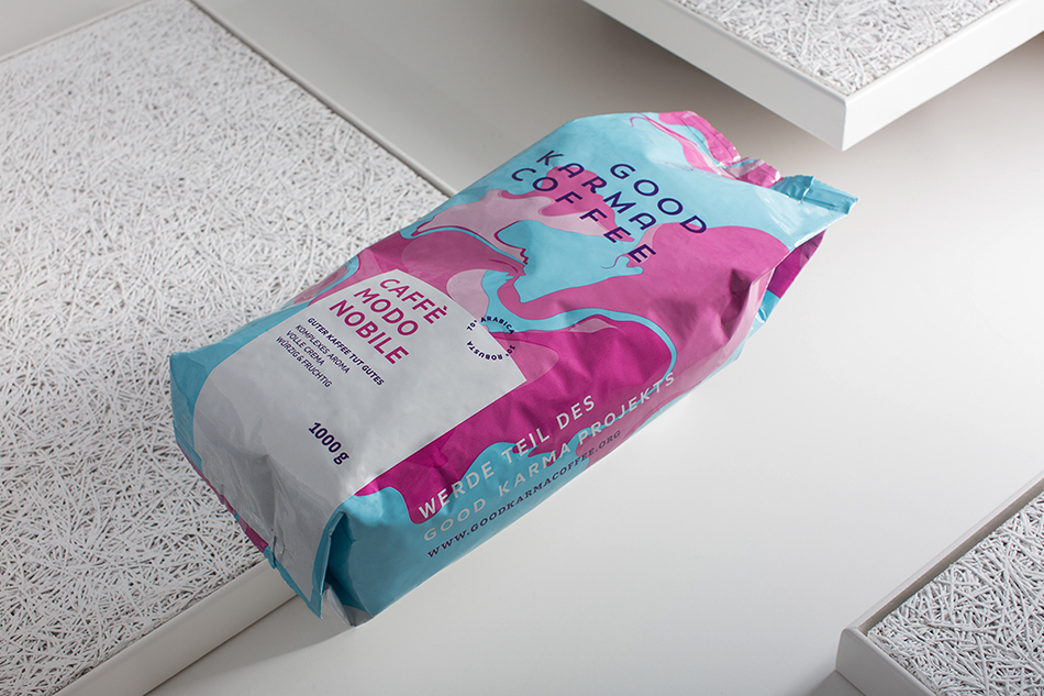 包装设计采用引人注目的色彩搭配、现代印刷工艺和品牌名称,体现出GOOD KARMA 咖啡是货架上陈列的高品质咖啡。
